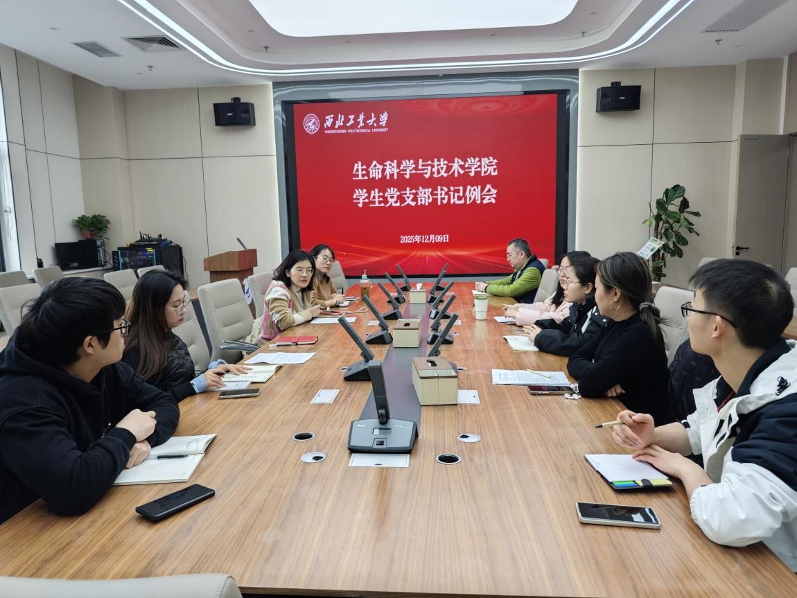 为进一步加强基层党组织建设,推动基层党建工作规范化、标准化、科学化开展,2025年12月9日中午,生命科学与技术学院召开学生党支部书记例会。院专职辅导员李健康、乔雪琪,全体学生党支部书记参加会议。会议由学院党委副书记张敏乔主持。