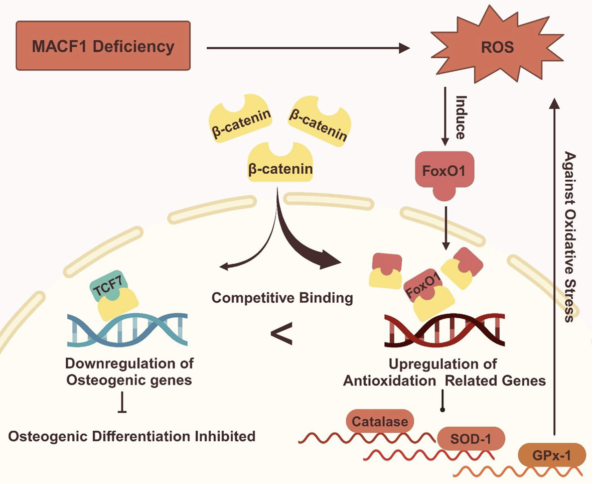 该论文首次阐明“MACF1 缺失-慢性氧化应激-FoxO1/β-catenin 轴”这一老年骨质疏松新通路,证实 FoxO1 是连接“氧化还原”与“成骨转录”的双重开关,为开发“抗氧化+靶向FoxO1”联合干预策略提供了实验与理论依据。