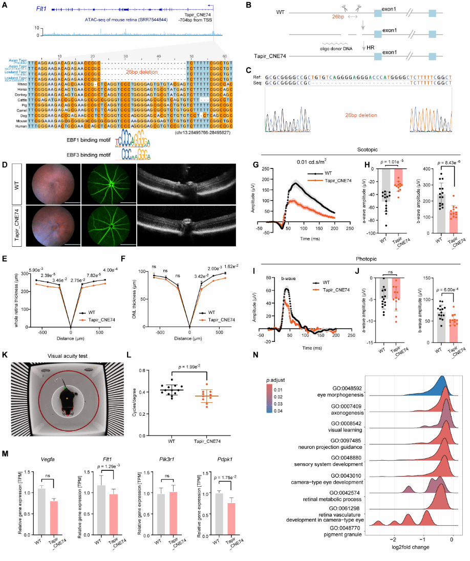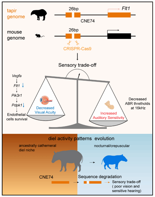 该研究中,研究团队首先组装获得了南美貘(Tapirus terrestris)和亚洲貘(Tapirus indicus)近乎完整的T2T染色体水平基因组。通过跨物种比较分析,团队发现在貘科演化中,感官调控区域发生广泛重塑,并鉴定出一系列特异的保守非编码元件(Conserved Non-coding Elements, CNEs)。其中,位于视网膜稳态关键基因(FLT1)上游的貘科特异的保守非编码元件CNE74尤为关键。为了探究这个貘科特异的CNE74是否直接导致了感官权衡的表型,团队利用CRISPR-Cas9技术在小鼠中精准编辑了该元件同源区。实验表明,小鼠再现了与貘高度相似的表型:视力显著下降(图2),但听觉获得代偿性增强。这清晰证实,CNE74这一顺式调控元件的变异,对视听系统产生了此消彼长的多效性(pleiotropic)影响(图3)。
