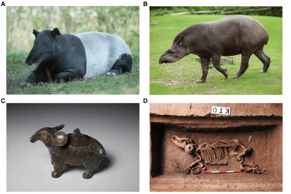 有趣的是,这一在演化长河中幸存的古老生物,也曾在中国历史上留下浓墨重彩的文化印记。2023年,陕西西安汉文帝霸陵出土了完整马来貘骨骸,证明其曾活跃于两千多年前的古都长安。更早的西周时期,它被铸成祭祀礼器“貘尊”;到了唐代,其皮毛“貘皮”成为珍贵的赏赐品。在民间部分典籍中,它被描述为能吞食噩梦的“食梦神兽”,被赋予驱邪避害的寓意(图1)。