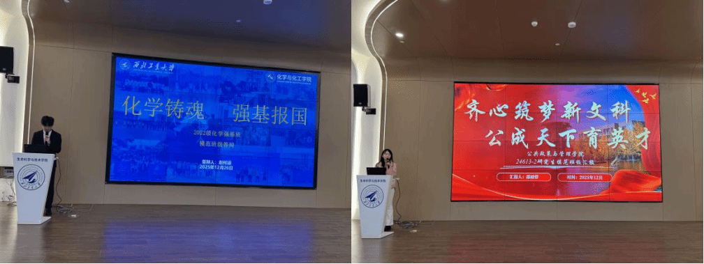 在分享环节,来自化学与化工学院22级强基班班长赵柯涵、公共政策与管理学院硕士24613-2班班长邵丽蓉,分别围绕班级建设、学风塑造、科研实践等方面分享校级模范班级建设的宝贵经验,强调集体荣誉的背后是每位成员的同心协力,良好氛围与协作精神是团队共进的关键。