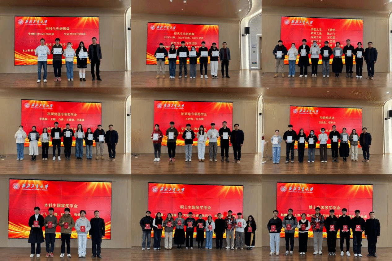 随后,于兆良、牛卫宁和段利兵依次为先进集体、单项之星和社会专项奖学金以及国家奖学金获得者代表颁发荣誉证书并合影留念。