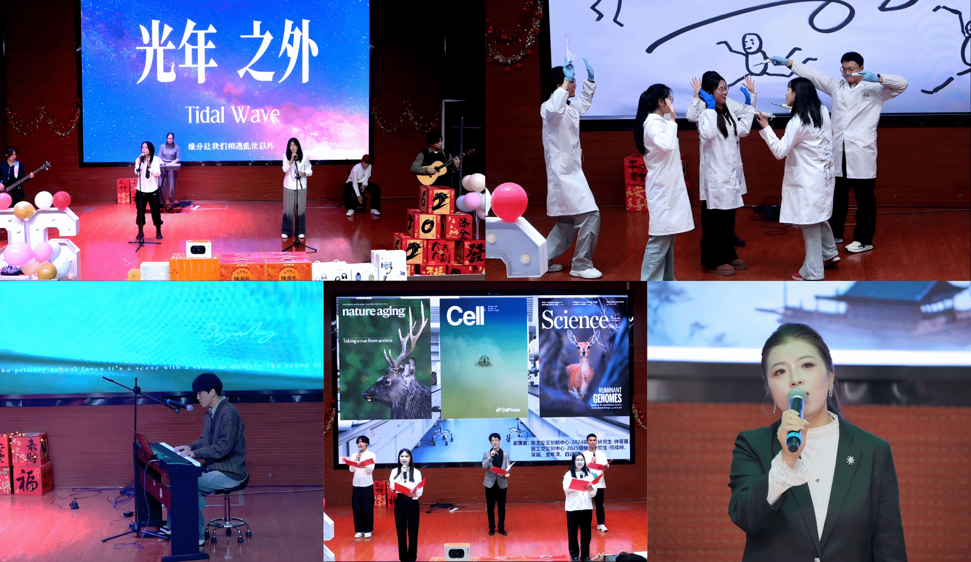 乐队组合演绎的《光年之外》以磅礴气势诠释探索精神;小品《实验室那点事儿》取材科研日常,用生动剧情展现师生在实验室里的坚守与欢笑;钢琴独奏《蒲公英的约定》旋律轻柔,传递出对未来的美好期许;诗朗诵《我爱科研》以铿锵有力的语调,抒发生科人对学术探索的执着与热爱;李琦老师独唱的《月亮照山川》意境悠远,展现了学院教师的多元风采。