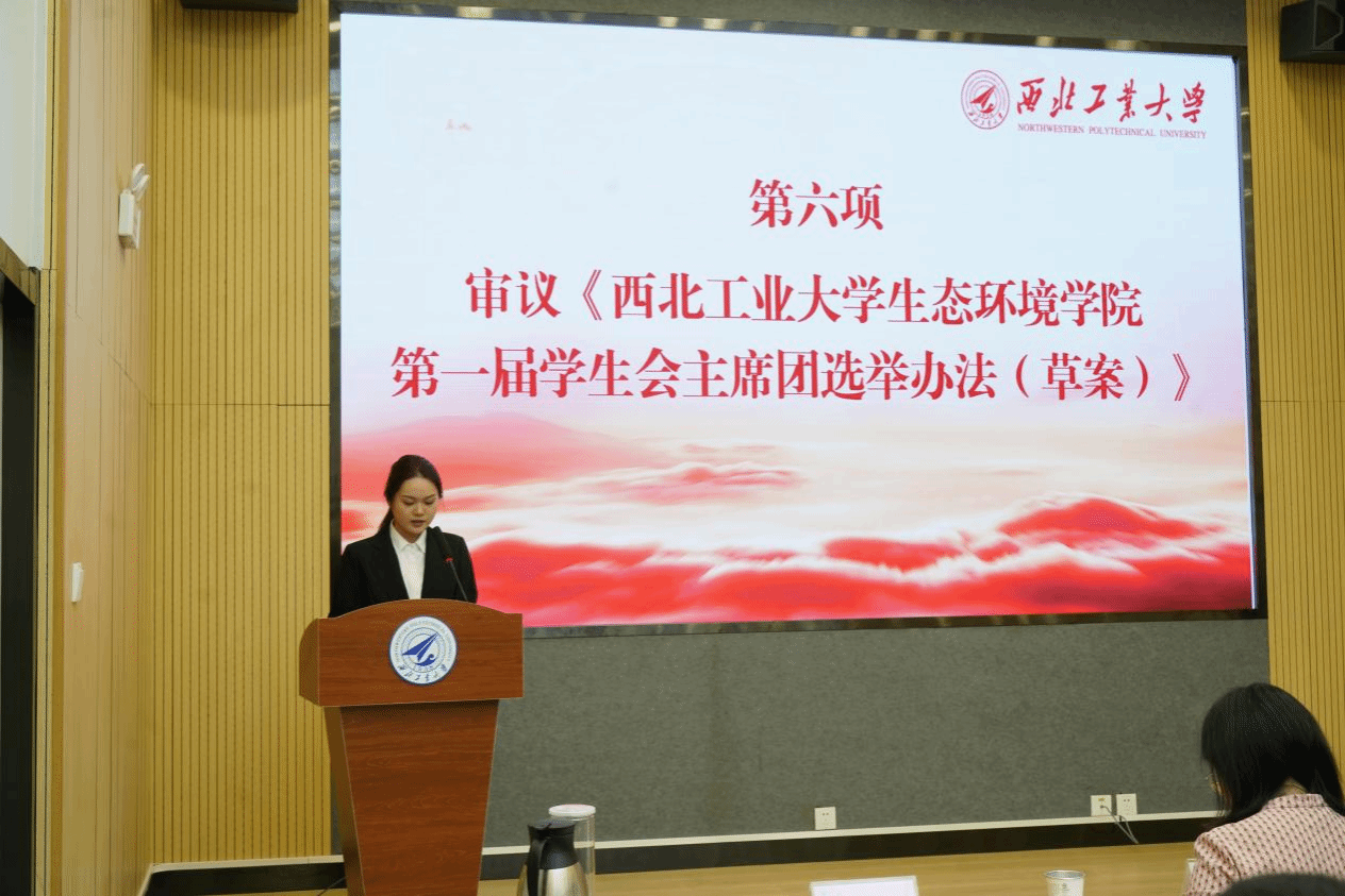会议审议通过了《西北工业大学生态环境学院第一届学生会主席团选举办法(草案)》《西北工业大学生态环境学院第一届学生会主席团候选人名单(草案》和《西北工业大学生态环境学院第一届学生会主席团选举总监票人、监票人、总计票人、计票人名单(草案)》。
