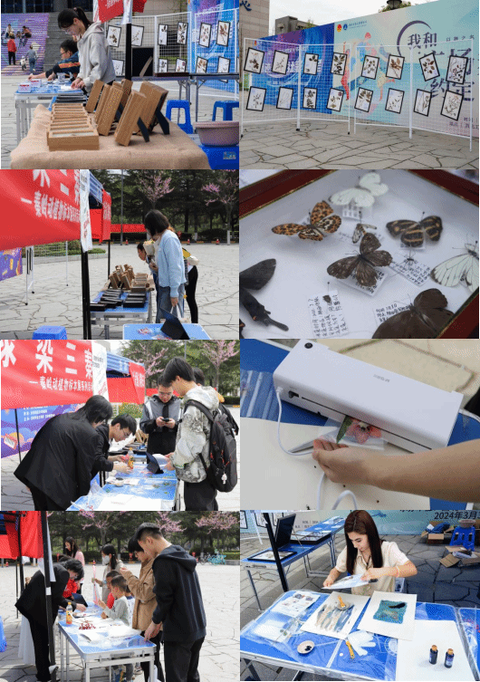在‘绿’染三秦·秦岭生态保护”活动中,同学们用多种多样的昆虫标本展示着对秦岭生态的无限热爱和无尽探索。活动现场还准备了塑封机、素描纸、蓝晒液等材料,鼓励大家积极寻找校园内丰富的植物品类,用塑封和古法“蓝晒”为它们留下春天的“倩影”。同学们在制作作品的过程中深切感受着生命的活力、春天的美好、生态的神奇。