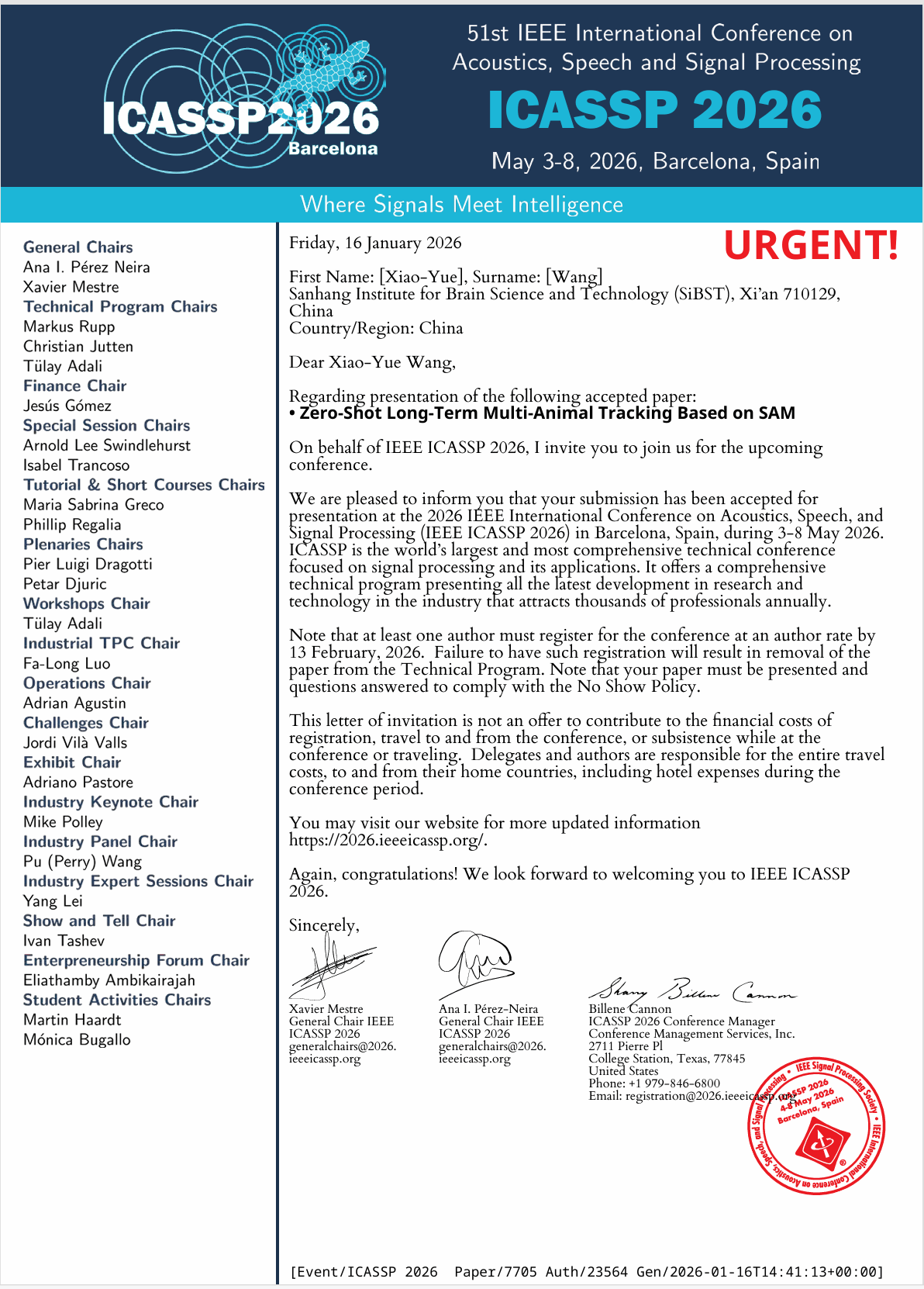 近日,2026国际声学、语音与信号处理年会(IEEE ICASSP 2026)发来录用通知,我院三航脑科学与脑技术研究中心和柔性电子研究院合作的关于多动物行为分析的最新研究成果《基于SAM的零样本长时多动物追踪》(Zero-Shot Long-Term Multi-Animal Tracking Based on SAM)被正式录用。